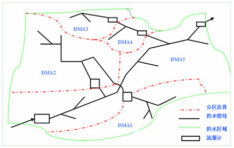 DMA分區(qū)管理是指在供水系統(tǒng)中建一個個被切割分離的獨立區(qū)域,通常采取關(guān)閉閥門或安裝流量儀表來形成虛擬或?qū)嶋H獨立區(qū)域。通過對進入或流出這一區(qū)域的水量進行計量,并對流量進行分析后來定量水的泄漏,便于檢漏人員準確的決定在何時何處檢漏,并進行主動的防泄漏控制。